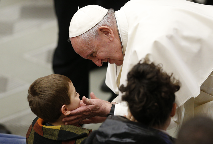 Фота: Папа Францішак вітаецца з хлопчыкам падчас сустрэчы з хворымі на агульнай аўдыенцыі ў зале Паўла VI у Ватыкане 20 лютага 2019 г. (CNS photo/Paul Haring)