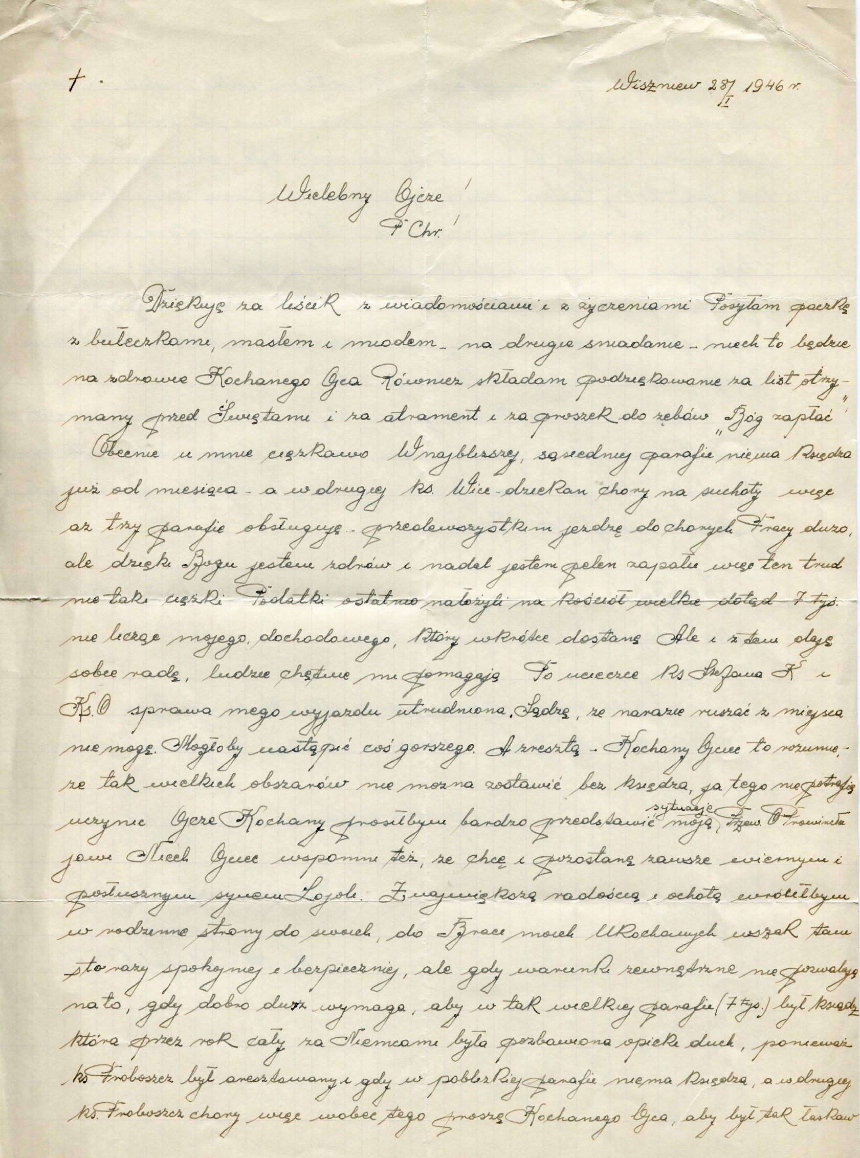 7 Архіў Вялікапольска-Мазавецкай правінцыі Таварыства Езуса ў Польшчы; Ліст кс. Станіслава Міхальскага SJ да настаяцеляў Таварыства Езуса дня 28.01.1946.