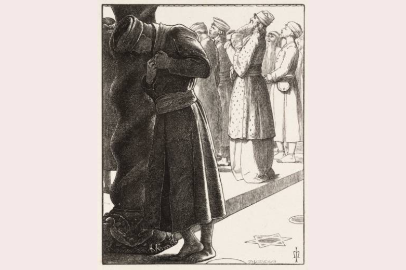 Езус расказаў такую прыпавесць некаторым упэўненым у сваёй праведнасці, якія пагарджалі іншымі: Два чалавекі зайшлі ў святыню памаліцца; адзін фарысей, а другі мытнік. Фарысей, стаўшы, маліўся сам сабе так: Божа, дзякую Табе, што я не такі, як іншыя людзі, рабаўнікі, несправядлівыя, распуснікі або як гэты мытнік. Пашчуся два разы на тыдзень, даю дзесяціну з усяго, што набываю.