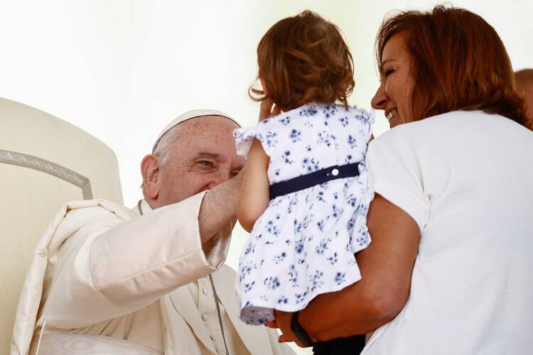 Фота: Папа Францішак вітае дзяўчынку падчас агульнай аўдыенцыі на плошчы Святога Пятра ў Ватыкане 28 верасня 2022 г. (Крыніца: CNS/Yara Nardi, Reuters).
